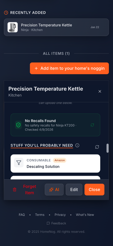 HomeNog is a simple home inventory app that helps homeowners organize appliances, warranties, manuals, and key home details.